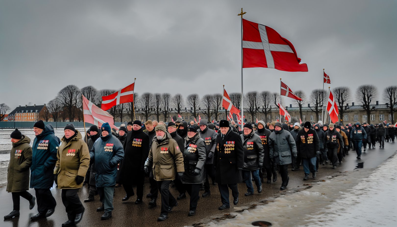 Hundrevis av danske veteraner og tusenvis av støttespillere samlet seg lørdag 31. januar 2026 utenfor USAs ambassade i København. I en stille protest la de ned 52 flagg for Danmarks falne i Afghanistan og Irak. Markeringen startet ved Copenhagens historiske Kastellet før veteranene marsjerte med store danske flagg til ambassaden.