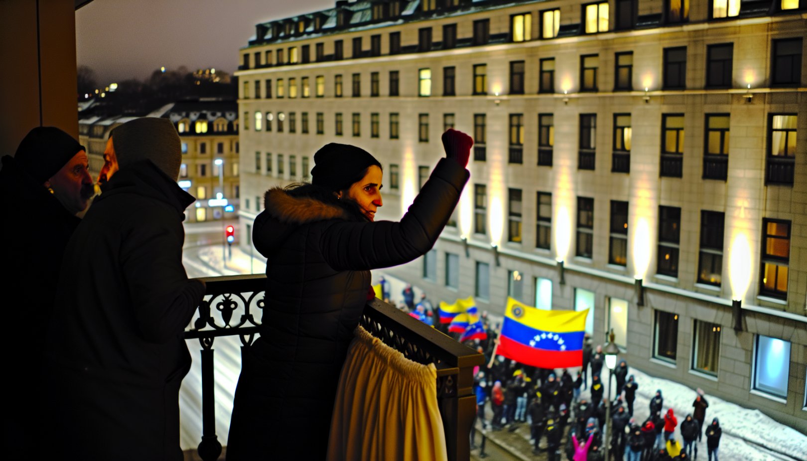 På Grand Hotel i Oslo ble Machado møtt av moren og datteren i nattens mørke. Utenfor hotellets balkong ble hun hyllet av fremmøtte venezuelanere som spontant sang nasjonalsangen i den kalde desembernatten.